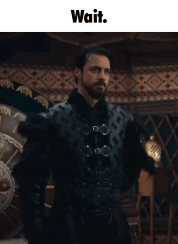 a man with a beard stands in front of a sign that says " wait "