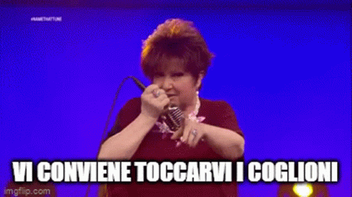 Italian singer Orietta Berti delivers her iconic line 'Vi Conviene Toccarvi I Coglioni' on stage.
