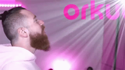 A man with a beard and man bun looks up in praise, with the word 'orkut' glowing in pink light.
