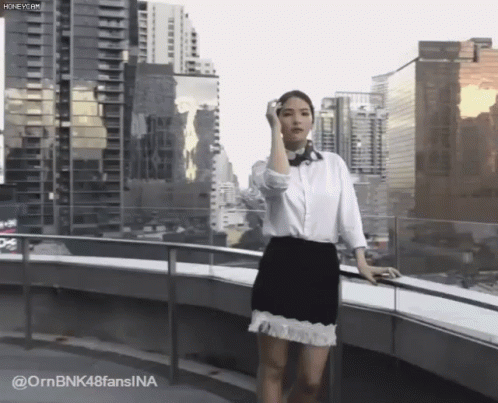 Orn BNK48 poses elegantly on a city rooftop, wearing a stylish white shirt and black skirt.