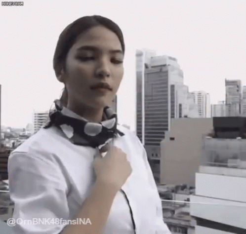 Orn BNK48 on a city balcony, elegantly adjusting her black and white polka dot scarf while wearing a white shirt.