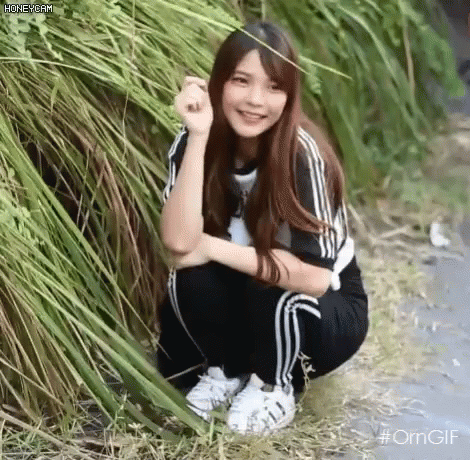 Orn BNK48 squats in tall grass, looking up with a sweet smile, wearing a black and white tracksuit.