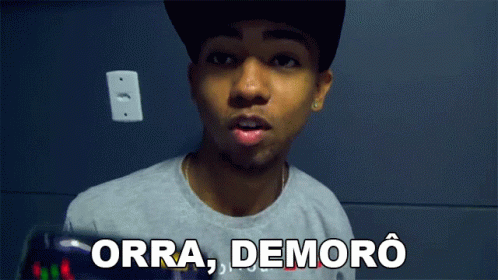 Everson Zoio, wearing a hat and gray shirt, says 'Orra, Demorô' while holding a phone displaying stock charts.