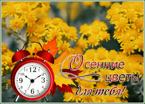 A vibrant greeting card featuring an alarm clock, autumn leaves, and yellow chrysanthemums with a Russian message.