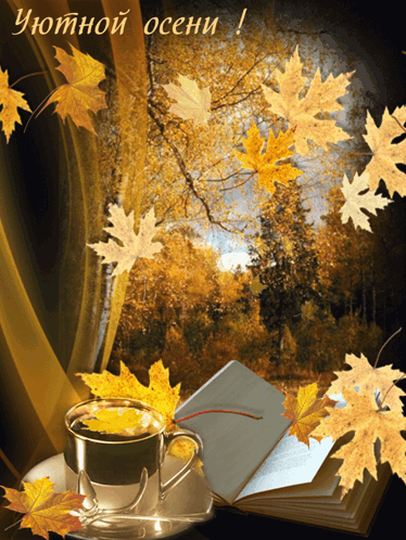 Enjoy a cozy autumn scene with falling leaves, a warm cup of coffee, and an open book.
