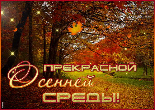 A vibrant autumn greeting card with a forest path and the message 'Of a beautiful autumn Wednesday!'