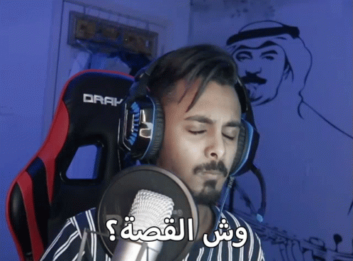 Man wearing headphones, looking surprised, with 'وش القصة؟' (What's the story?) caption.