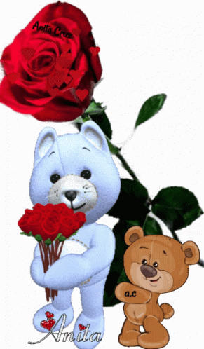 Animated graphic featuring a blue osito holding red roses, a brown osito, and a large red rose.