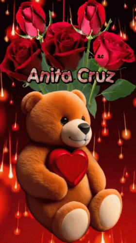 An animated teddy bear (osito) holding a heart, surrounded by red roses and sparkling lights, with the name Anita Cruz.