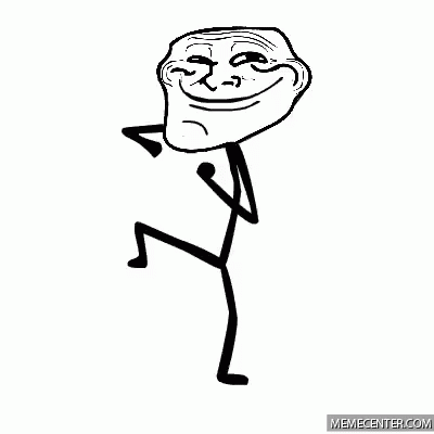 A black and white animation of a troll face stick figure dancing, followed by the text 'YOU MAD' appearing.