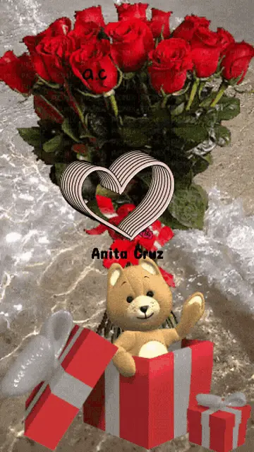A cute teddy bear holds red roses, surrounded by vibrant purple and yellow roses with butterflies, and the word 'Love'.
