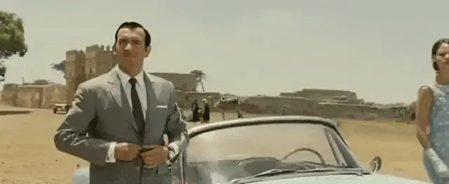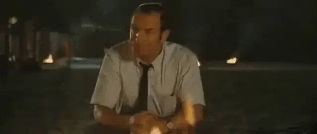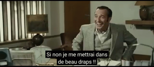 Oss, a man in a suit, laughs heartily at a desk in an office, with a French caption visible.