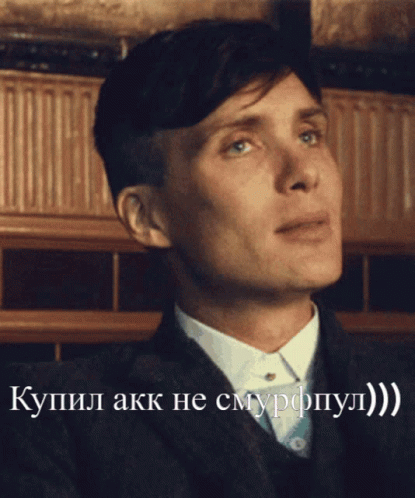 Cillian Murphy as Thomas Shelby from Peaky Blinders smiles in a popular Russian Dota meme about buying an account.