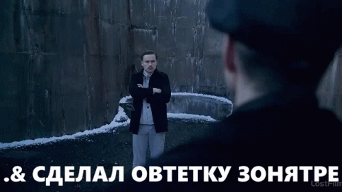 Thomas Shelby from Peaky Blinders confronts another man in a snowy, industrial setting, with a Russian caption.