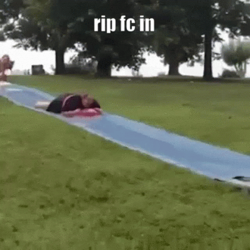 A person slides down a water slide, referencing the 'Rip FC in Lynxie DMs' meme, associated with Osu Cookiezi.