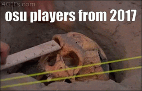 A person excavates an ancient-looking skull, humorously labeled 'osu players from 2017', implying their age.
