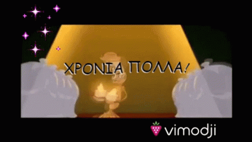 Animated lamp character in a spotlight with the Greek greeting 'Happy Birthday!' and sparkling effects.