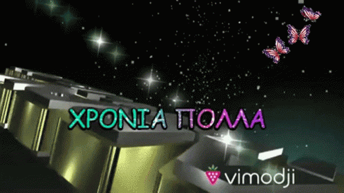 Animated birthday greeting featuring 'Happy Birthday' and 'Χρόνια Πολλά' text with sparkling effects and butterflies.