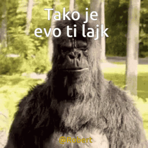 A gorilla giving a thumbs up and pointing, with the text 'Tako je evo ti lajk' and '@Robert'.