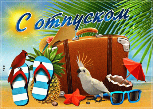 A colorful animated greeting card wishing 'Happy Vacation' with beach items like a suitcase, parrot, flip-flops, and sunglasses.