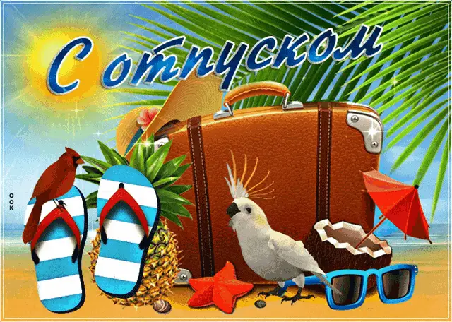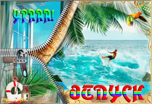 Exciting split-screen view of a tropical vacation, featuring a surfer riding a wave and the text 'HURRAY! VACATION'.