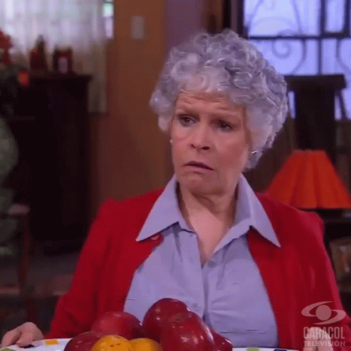 Dona Ruca (Maria Margarita Giraldo) looks annoyed, expressing 'Otra Vez La Mula Al Trigo' while holding a fruit platter.