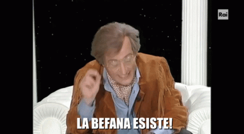Corrado Guzzanti emphatically declares 'La Befana Esiste!' while sitting on a white couch.