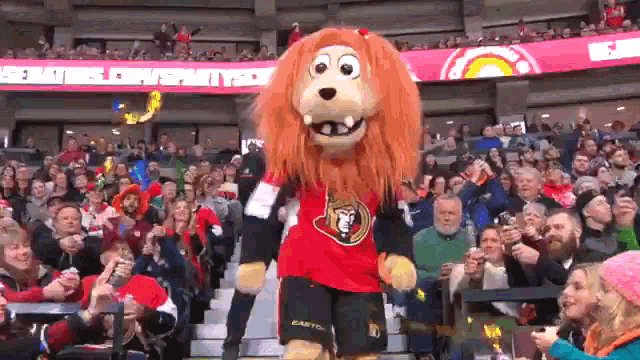 Spartacat, the Ottawa Senators mascot, celebrates with fans as confetti falls in the arena.
