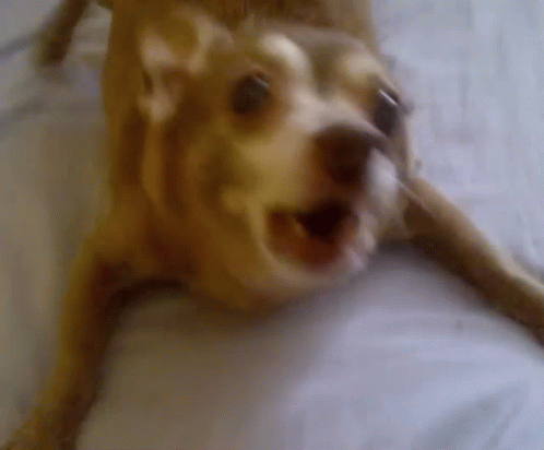 Otto Ottinho, a small dog, looks up with big eyes while lying down, showing affection.