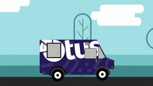 An animated purple Otus delivery truck drives through a stylized urban landscape.