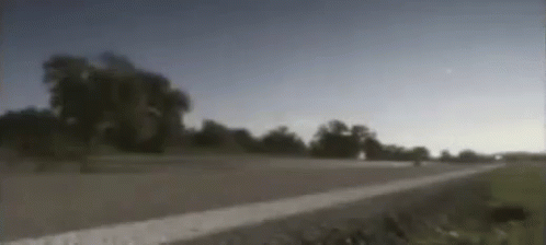 A blurry, fast-paced view from a motorcycle speeding down a road with trees and fields in the background.