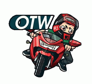 A cartoon man in a helmet rides a red sportbike, ready for his journey, embodying the 'on the way' spirit.
