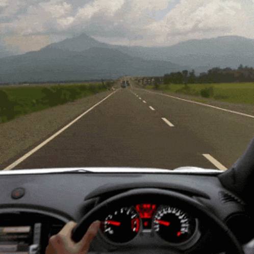 Driving 'Otw Kab' through scenic roads in Ramung Jaya, with mountains in the background.