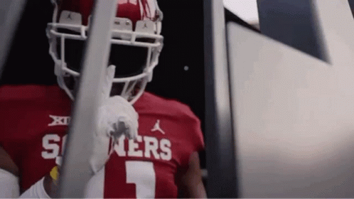 Oklahoma Sooners football player in red jersey and white helmet, featuring OU and Jordan logos.