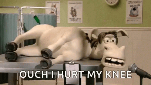 A claymation horse from Creature Comforts lies on a vet table, comically exclaiming 'Ouch I hurt my knee.'