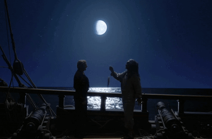 Blackbeard (Ed) and Stede Bonnet on a ship at night, with Ed holding a fish under the moon in Our Flag Means Death Season 2.