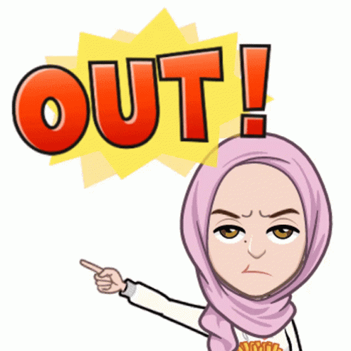 An angry cartoon woman in a pink hijab points, emphatically saying 'OUT!' with a stern expression.