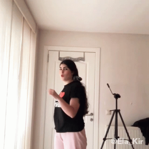Ela Kir performs a quick outfit change, transforming from a casual look to a more formal one with a spin.