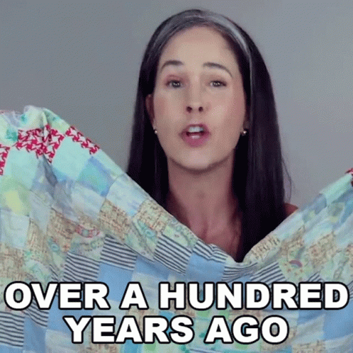 Rachel Smith holds up a patchwork quilt, discussing something from 'Over A Hundred Years Ago'.