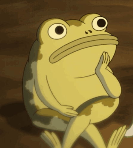 A thoughtful frog from Over The Garden Wall sits, listening intently and contemplating.