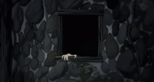 An eerie skeletal hand reaches out from a dark opening in a stone wall, reminiscent of Over The Garden Wall.