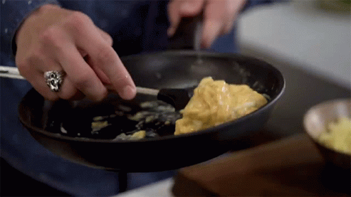 Mohamad Hindi cooking scrambled eggs in a frying pan, wearing a distinctive ring.