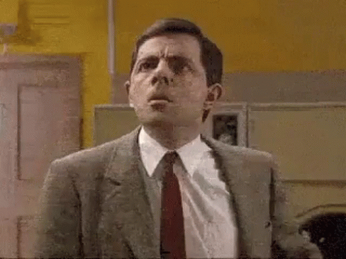 Mr. Bean (Rowan Atkinson) reacts with a disgusted face, stating 'But it's obvious' in Italian.