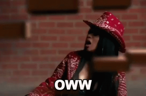 Cardi B in a red bandana-print cowboy hat and jacket, making an 'Oww' expression.