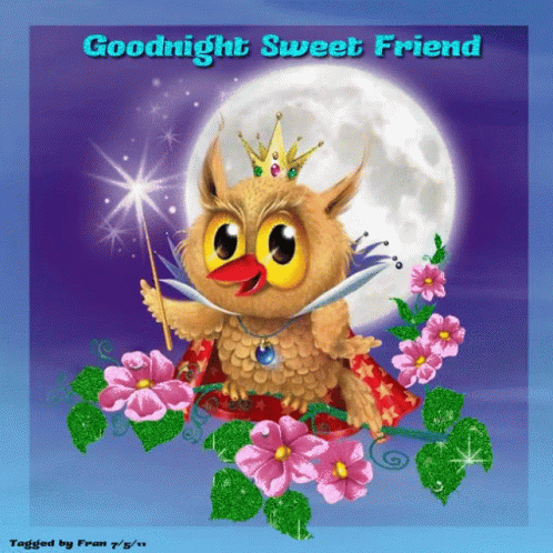 Charming owl wearing a crown and holding a wand, wishing a good night with glitter and sparkle.