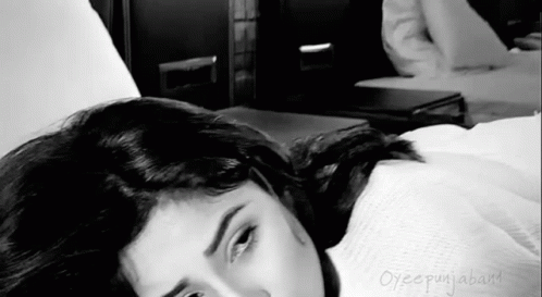 Shehnaaz Gill, also known as Sana Gill, peacefully resting on a bed in a black and white scene.