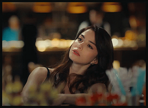 Ozge Gurel, also known as Ezgi Inal, looking sad and possibly drunk at a table with straws.