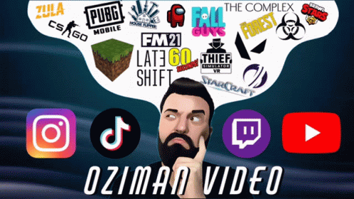 Oziman, a bearded man, surrounded by popular video game and social media logos, representing a content creator.