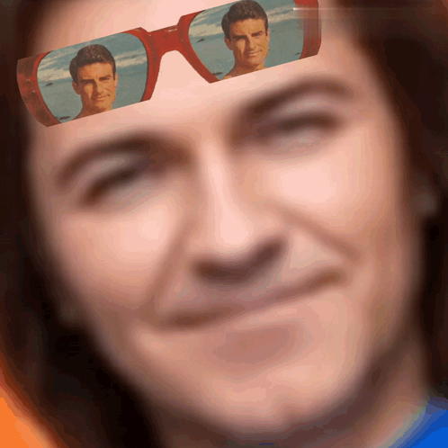 A man wears red sunglasses reflecting another man, while a military tank appears and disappears.