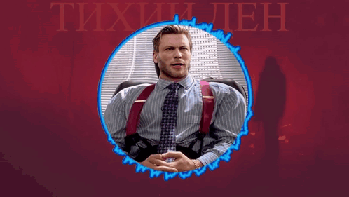 Man in a suit and suspenders, resembling Patrick Bateman, in an audio visualizer with Russian text 'Тихий Дэн'.
